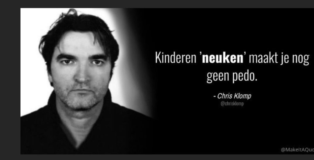 Zie artikel: https://www.de-nieuwe-media.nl/l/chris-klomp-schreef-op-twitter-kinderen-neuken-maakt-je-nog-geen-pedo/