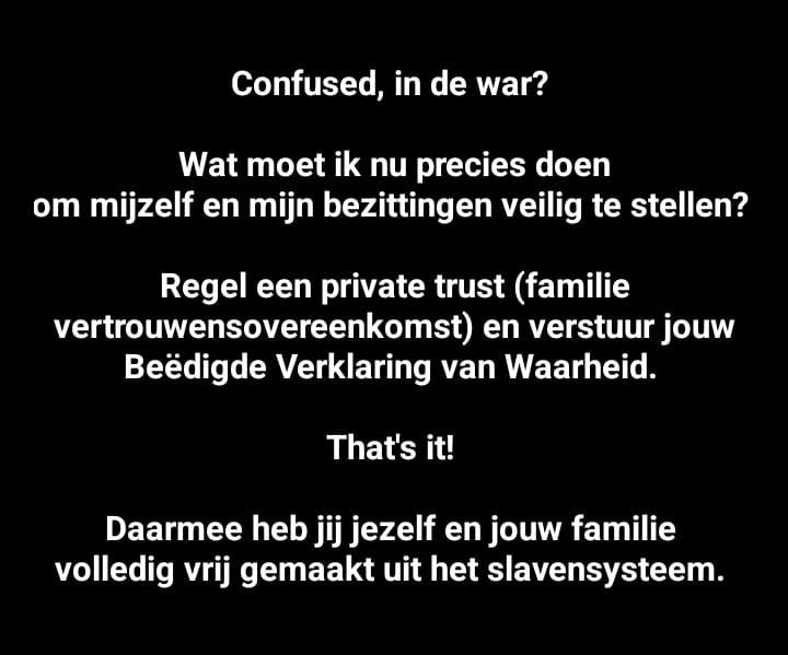 Eike maakte dus (heel goed van hem!) een eigen 'Verklaring van Waarheid' op van zijn eigen waarheid (waarvoor dank!) en vatte dat samen in een duidelijk document, zie de onderstaande rode button. Ga het document (Beëdigde Verklaring van Waarheid 6.0) ook eens lezen en er ook naar handelen om jezelf vrij te maken uit het slavensysteem.