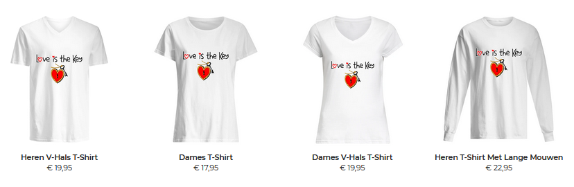 Zowel als kinder T-shirts als dames T-shirts en in vele andere uitvoeringen.